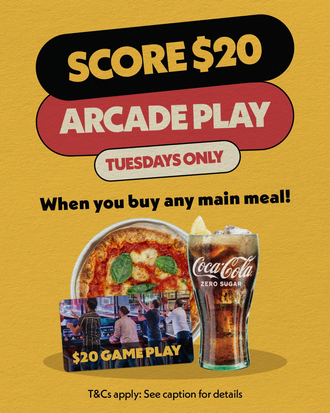 T&Cs apply: $20 arcade card with every main meal purchased. Not valid with any other offer. Excludes kids meals & snacks. Not valid on school or public holidays